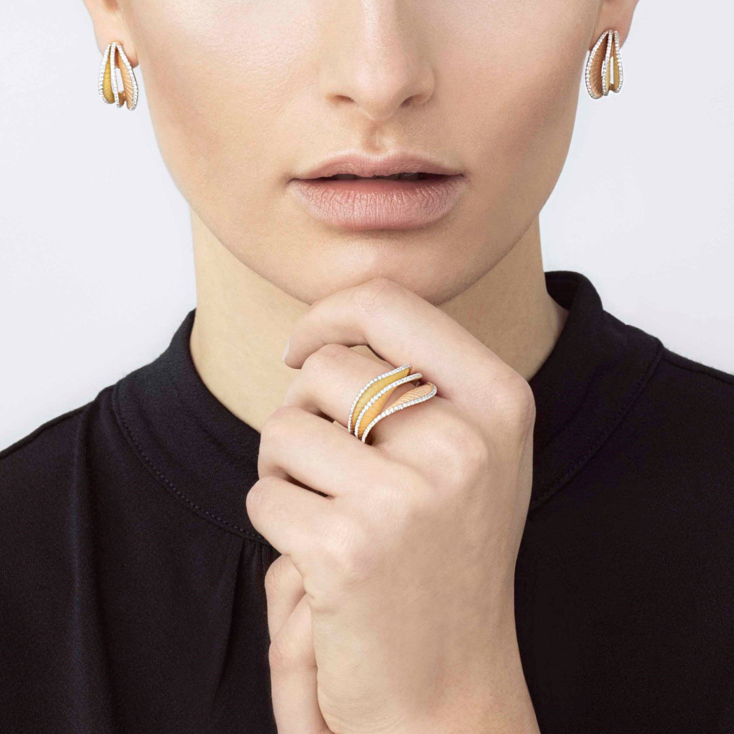 Unser Designer of the Month im Februar kommt aus Italien, genauer: aus Florenz. Annamaria Cammilli bezaubert durch Schmuck, der sich in floralen und fließend geometrischen Mustern ergießt und durch fein strukturierte Oberflächen auszeichnet. Ihre Schmuckstücke, von der Natur inspiriert, wirken leicht und luftig und sind aus feinsten Materialien gefertigt: 18 karat Gold, Diamanten und Farbedelsteine. Apropos Gold: Acht Goldfarben hat Annamaria Cammilli entwickelt, eine schöner als die andere, jede mit einer besonderen Ausstrahlung, die durch die Oberflächenbearbeitung betont wird. Das Wechselspiel von samtig wirkenden Flächen mit glänzenden und seidigen Effekten macht die Stücke – neben ihrer ausdrucksstarken Formensprache – unverwechselbar. Heute wird das 1983 von Annamaria gegründete Unternehmen von Sohn Riccardo Renai geführt. Seit zwei Jahren gibt es in Florenz die Cammilli-Akademie, in der das besondere Wissen und Können des Unternehmens weitergegeben wird.