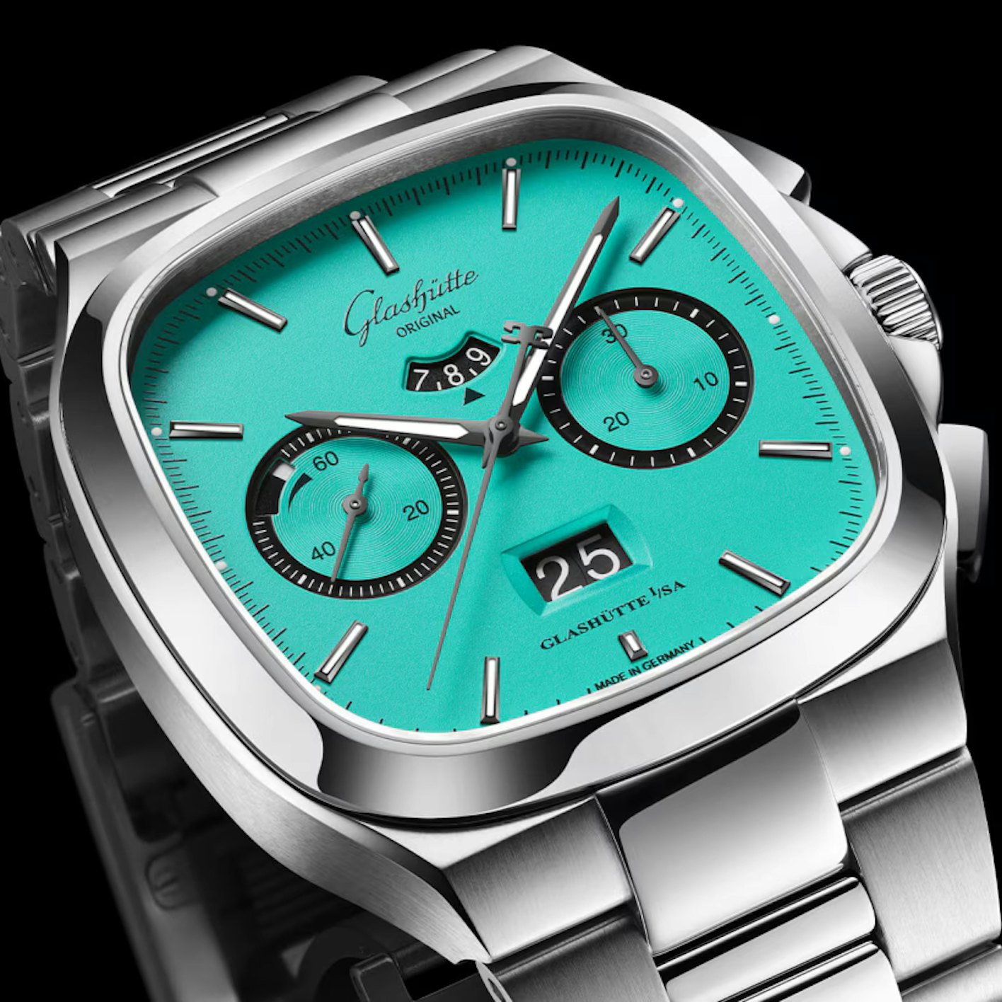 Einmalig und hier auch sehr authentisch sind die Modelle der Seventies Kollektion, die auf historischen Modellen der Manufaktur aus eben diesen bunten 1970er Jahren beruhen. Es gibt wohl kaum nochmals eine so harmonische Uhr, die nicht rund ist und so kommt es auch nicht von ungefähr, dass in den letzten Jahren die Glashütte Original Seventies immer mal wieder durch neue limitierte Editionen mit knalligen Farben bereichert wurde. Besonders bemerkenswert ist hier die neue olivgrüne Version des Kult-Chronographen.
