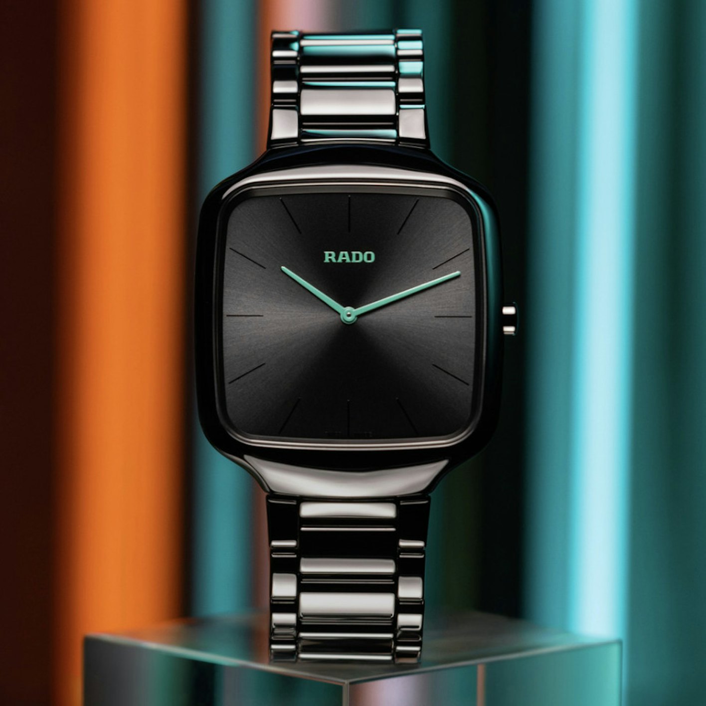 Im Jahr 1990 erlebte die Welt die Premiere der Rado Ceramica , deren Design das Uhrengehäuse und das Armband aus Hightech-Keramik mit dem Saphirglas vollständig zu einer Einheit verschmelzen lässt. Die Rado Ceramica erfuhr 2016 eine Neuauflage, für deren Gestaltung der deutsche Produktdesigner Konstantin Grcic verantwortlich zeichnete. Seine Uhr übernimmt ein puristisches Design, die rechteckige Form und das Material Keramik von der Original Ceramica. Bei einer Größe von 30 mal 41,7 Millimetern ist ihr Gehäuse gerade einmal 7,1 Millimeter dick, darin arbeitet ein Quarzuhrwerk.