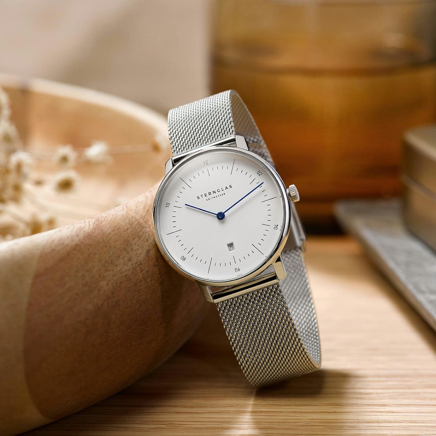 zur Sternglas Automatik KollektionDie Sternglas Naos verkörpert die Marke seit 2018 wie kein anderes Modell. Eine zeitlose Dresswatch, die zu jedem Anlass passt. Absolut kratzfest durch Saphirglas, passt sie mit nur sechs Millimetern Gehäusehöhe unter jeden Hemdsärmel. Sie trägt ein verlässliches Quarzuhrwerk des Schweizer Traditionsherstellers Ronda in sich.
