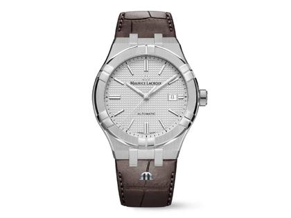 Maurice Lacroix Aikon Automatik Edelstahl 42mm silbernes Zifferblatt braunes Lederband
