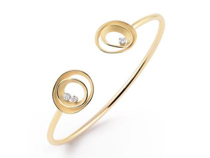 Armreif aus 750/- Gelbgold (Yellow Sunrise), runde Endstücke, poliert und satiniert, 3 Brillanten zusammen 0,18 ct TW vsi, offen