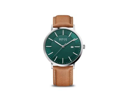 Bering Solar Edelstahl 39mm grünes Zifferblatt braunes Lederband