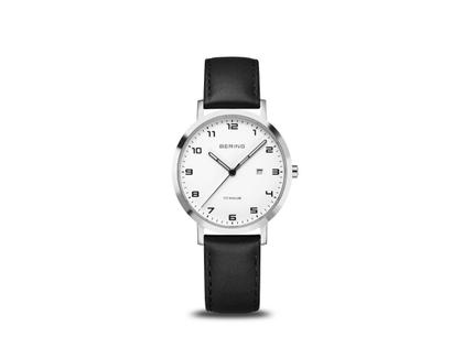Bering Titanium Quarz Titan 34mm weißes Zifferblatt schwarzes Lederband