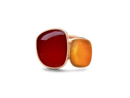 Ring aus 750/- Roségold, Karneol mit Perlmutt (Dublette) und Madeira-Citrin mit Perlmutt (Dublette), 1 Brillant 0,02 ct TW(G) vs