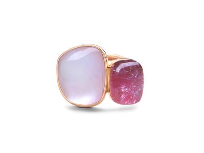 Ring aus 750/- Roségold, Rosenquarz und Perlmutt (Dublette) und Rubin mit Perlmutt und Bergkristallkappe (Triplette), 1 Brillant 0,02 ct TW(G) vs