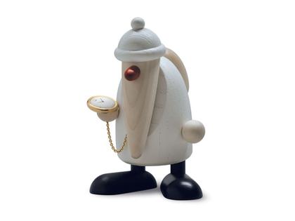 Weihnachtsmann aus Holz, weißer Mantel, rote Nase, goldene Taschenuhr mit Uhrenkette