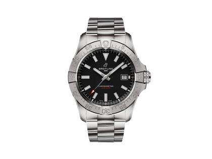 Automatikkaliber Breitling 17, 42 Stunden Gangreserve, Edelstahlgehäuse, 42 mm Durchmesser, schwarzes Zifferblatt mit Datum auf 3 Uhr, einseitig drehbare Lünette, beidseitig entspiegeltes Saphirglas, verschraubte Krone, Edelstahlband mit Faltschließe, 22 mm Bandanstoß, verschraubter Edelstahlboden, 30 bar wasserdicht