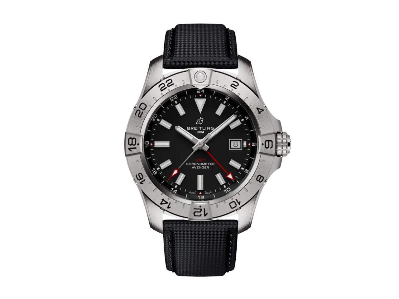 Breitling Avenger GMT 44 Automatik Edelstahl schwarzes Zifferblatt schwarzes Lederband