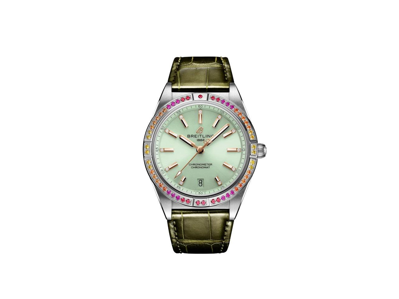 Automatikwerk, C.O.S.C. Chronometer, Edelstahlgehäuse mit einem Durchmesser von 36 mm, Höhe 10 mm, minzgrünes Zifferblatt mit 11 Brillanten 0,045 ct TW vsi, drehbare Lünette mit farbigen Saphiren, Datumsanzeige, grünes Alligator-Lederband mit Faltschließe, beidseitig entspiegeltes Saphirglas, verschraubte Krone, 10 bar wasserdicht