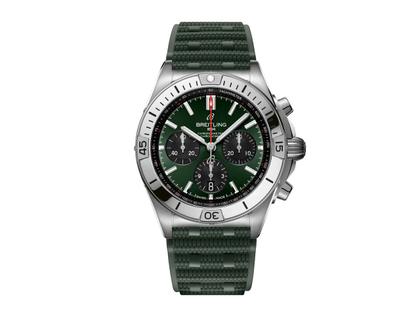 Breitling Manufaktur Kaliber 01, Automatikwerk, C.O.S.C. Chronometer, 70 Stunden Gangreserve, Edelstahlgehäuse, Durchmesser 42,0 mm, drehbare Lünette, verschraubte Krone, grünes Zifferblatt mit Indizes und Datumsanzeige auf 6 Uhr, kleine Sekunde, grünes Rouleaux-Kautschukarmband mit Faltschließe, beidseitig entspiegeltes Saphirglas, verschraubter Saphirglasboden, 20 bar wasserdicht