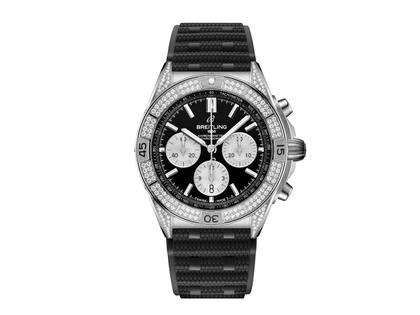 Schweizer Automatik Manufakturkaliber Breitling 01 mit COSC-Zertifizierung und einer Gangreserve von 70 Stunden, Chronometer, Gehäuse aus Edelstahl im Durchmesser von 42,0 mm, Höhe 15,1 mm, verschraubte Krone aus Edelstahl mit zwei Dichtungen, einseitig drehbare Lünette aus Edelstahl mit Sperre, schwarzes Zifferblatt mit silberfarbenen Totalisatoren, Tachymeterskala und Stoppfunktion auf dem Zifferblatt-Außenring, 30-Minuten-Zähler auf 3 Uhr, Datumsanzeige und 12-Stunden-Zähler auf 6 Uhr, kleine Sekunde auf 9 Uhr, silberfarbene Zeiger und Indizes mit weißer Super-LumiNova Leuchtmasse, Gehäuse und Lünette besetzt mit 176 Diamanten im Brillant-Schliff zusammen 1,30 ct TW vsi, schwarzes Kautschukarmband mit Faltschließe aus Edelstahl, bombiertes Saphirglas, beidseitig entspiegelt , verschraubter Gehäuseboden aus Edelstahl mit Saphirglas-Einsatz, 20 bar wasserdicht