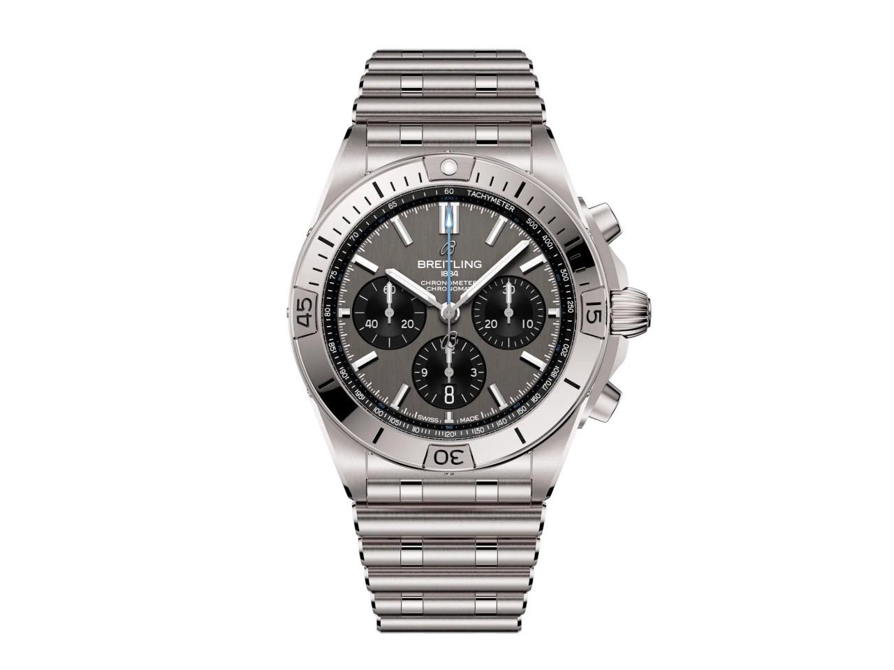 Breitling Manufaktur Kaliber 01, Automatikwerk, C.O.S.C. Chronometer, 70 Stunden Gangreserve, Titangehäuse, Durchmesser 42 mm, Titanlünette, verschraubte Krone, anthrazitfarbenes Zifferblatt mit Indizes und Datumsanzeige auf 6 Uhr, kleine Sekunde, Rouleaux-Titanarmband mit Faltschließe, beidseitig entspiegeltes Saphirglas, verschraubter Saphirglasboden, 20 bar wasserdicht