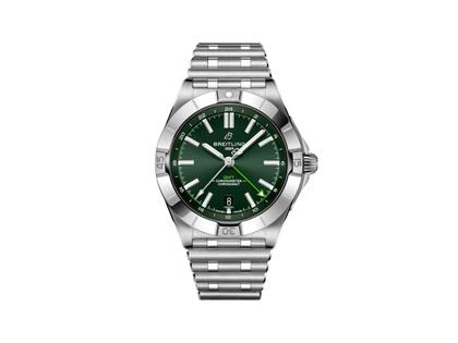 Breitling Kaliber 32, Automatikwerk, C.O.S.C. Chronometer, 42 Stunden Gangreserve, Edelstahlgehäuse mit einem Durchmesser von 40 mm, Platin-Lünette, Höhe 11,7 mm, grünes Zifferblatt mit Indizes und Datumsanzeige, hellgrüner GMT-Zeiger, Rouleaux-Band, beidseitig entspiegeltes Saphirglas, verschraubte Krone, verschraubter Edelstahlboden, 20 bar wasserdicht, limitiert und nur in Deutschland erhältlich.