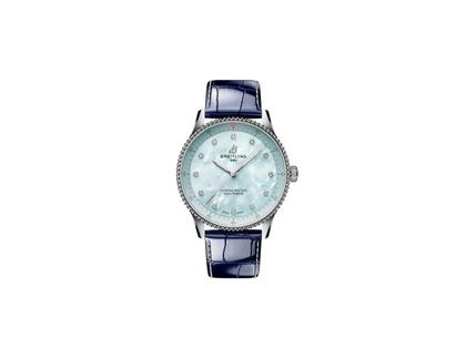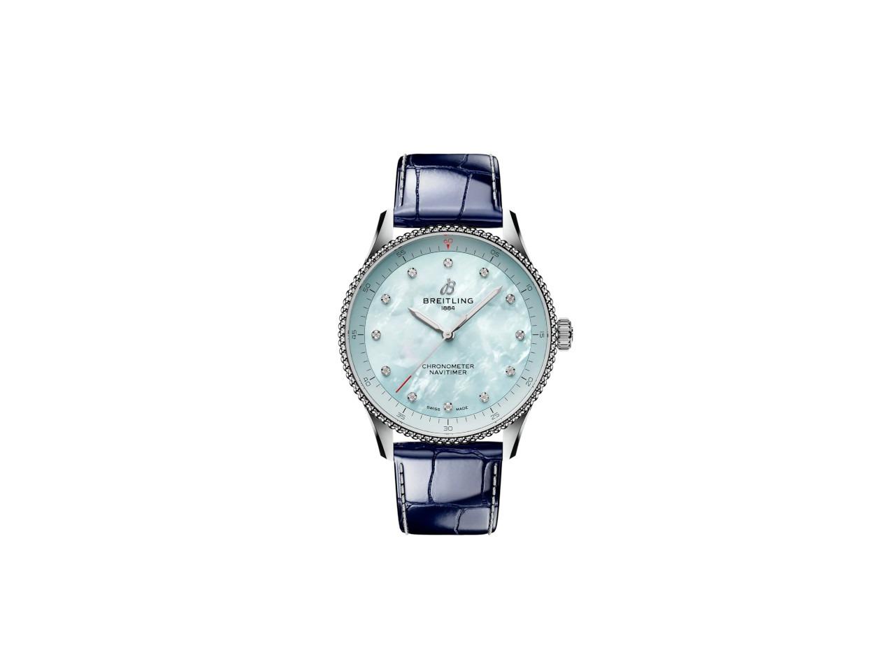 Breitling Navitimer 32 Quarz Edelstahl hellblaues Perlmutt-Zifferblatt blaues Lederband