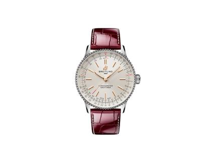 Breitling Navitimer Automatic 36 Edelstahl champagnerfarbenes Zifferblatt bordeauxrotes Lederband