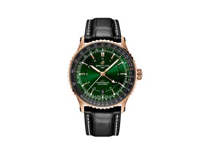 Breitling Navitimer Automatic GMT 41 Chronometer Rotgold grünes Zifferblatt schwarzes Lederband