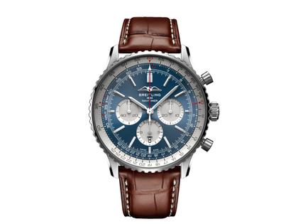 Breitling Navitimer B01 Chronograph 46 Edelstahl blaues Zifferblatt braunes Lederband