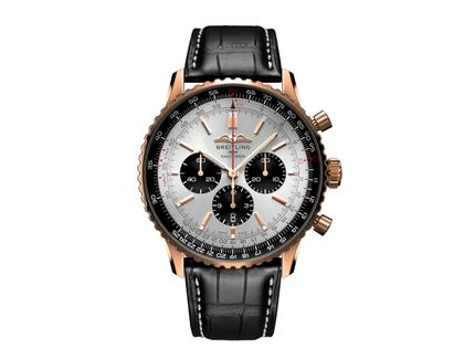 Breitling Navitimer B01 Chronograph 46 Rotgold silbernes Zifferblatt schwarzes Lederband