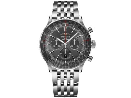 Manufakturkaliber: Automatikwerk, Kaliber 01, Chronometer, Edelstahlgehäuse im Durchmesser von 46 mm, graues Zifferblatt, Datumsanzeige bei 6 Uhr, Stoppfunktion, inneliegender Rechenschieber, Edelstahlband Navitimer mit Faltschließe, bombiertes Saphirglas, beidseitig entspiegelt, AOPA-Logo, Re-Design des Uhrwerks mit neuer Schwungmasse, 3 bar wasserdicht