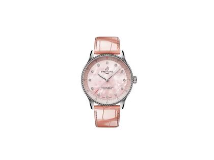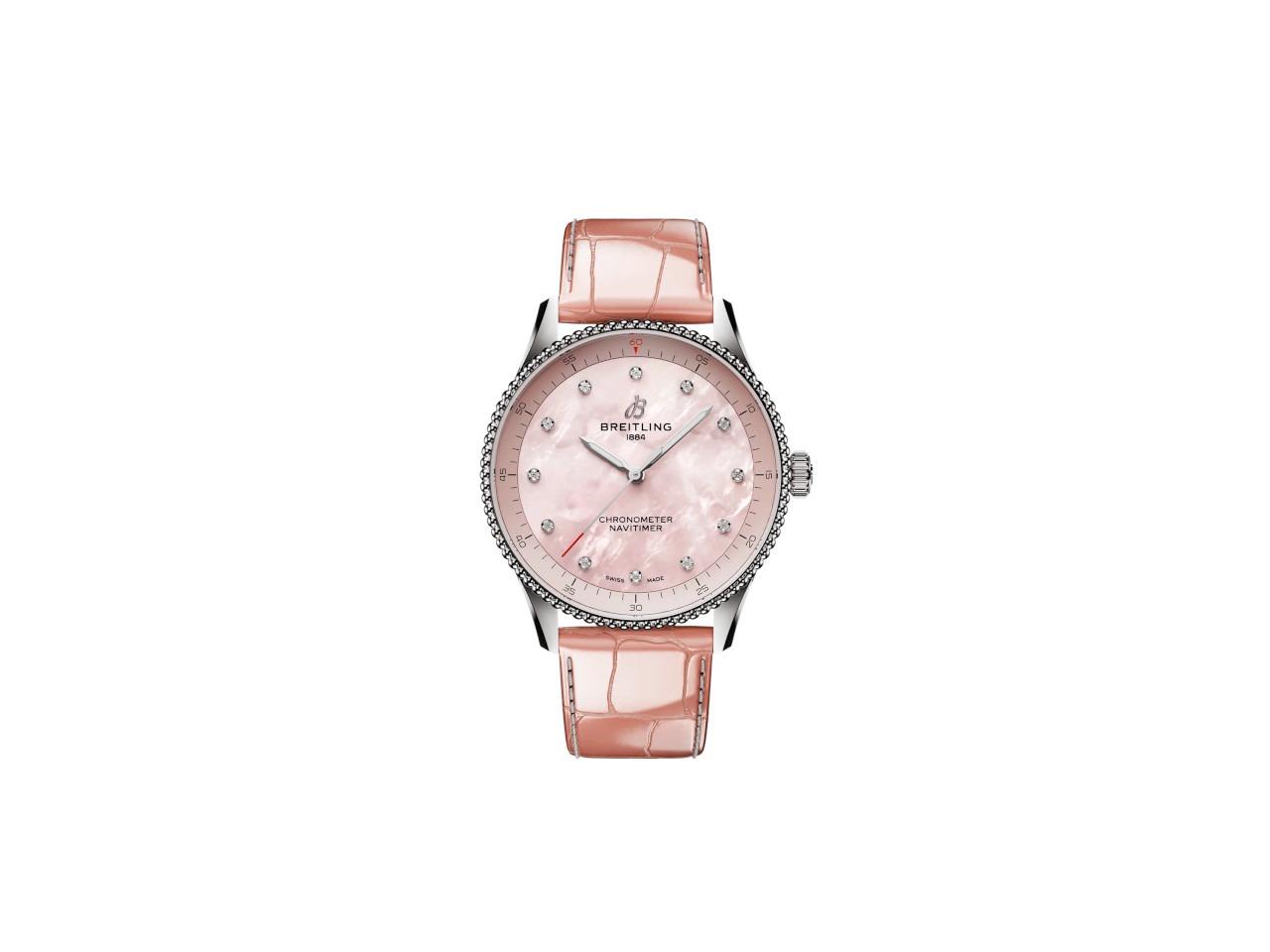 Breitling Navitimer 32 Quarz Edelstahl rosafarbenes Perlmutt-Zifferblatt rosafarbenes Lederband