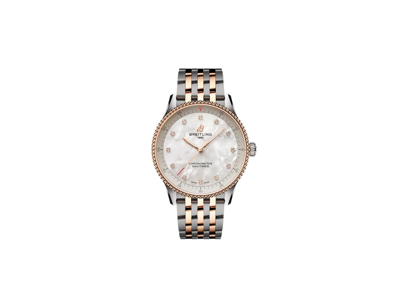 Quarz, Kaliber 77, Edelstahl-Rotgold-Gehäuse, 32 mm Durchmesser, verschraubte Krone, weißes Perlmutt-Zifferblatt mit 12 im Labor entstandenen Brillanten mit zusammen 0,067 ct TW vsi, Edelstahl-Rotgold-Band Navitimer mit Faltschließe, bombiertes Saphirglas beidseitig entspiegelt, 5 bar wasserdicht