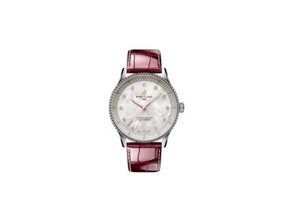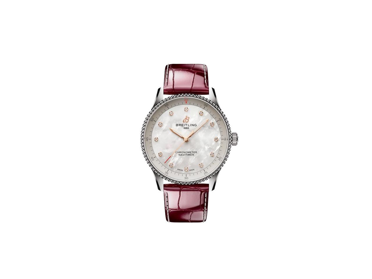 Breitling Navitimer 32 Quarz Edelstahl weißes Perlmutt-Zifferblatt bordeauxrotes Lederband