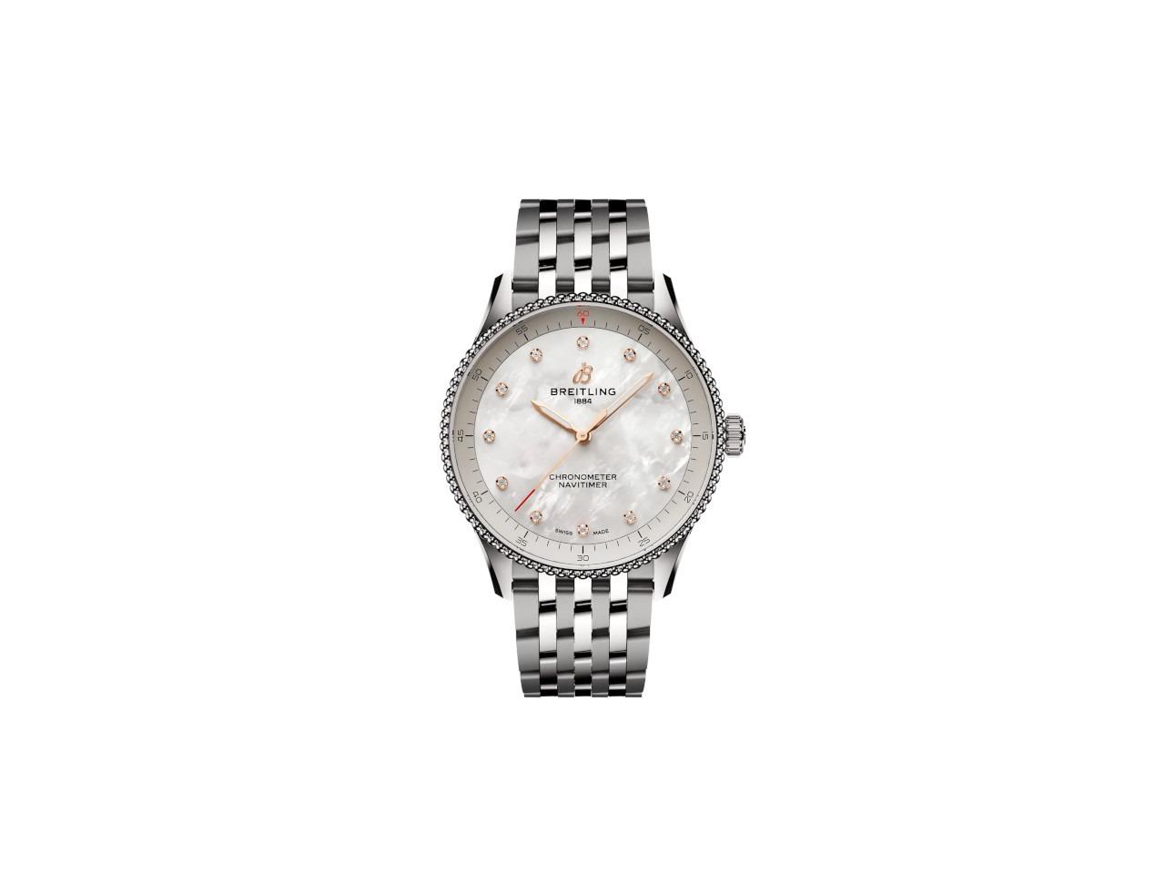 Quarz, Kaliber 77, Edelstahlgehäuse, 32 mm Durchmesser, verschraubte Krone, weißes Perlmutt-Zifferblatt mit 12 im Labor entstandenen Brillanten mit zusammen 0,067 ct TW vsi, Edelstahlband Navitimer mit Faltschließe, bombiertes Saphirglas beidseitig entspiegelt, 5 bar wasserdicht