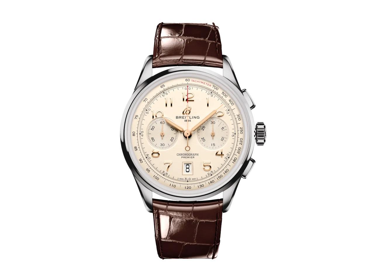 Breitling Premier B01 Chronograph 42 Automatik Edelstahl beiges Zifferblatt braunes Lederband