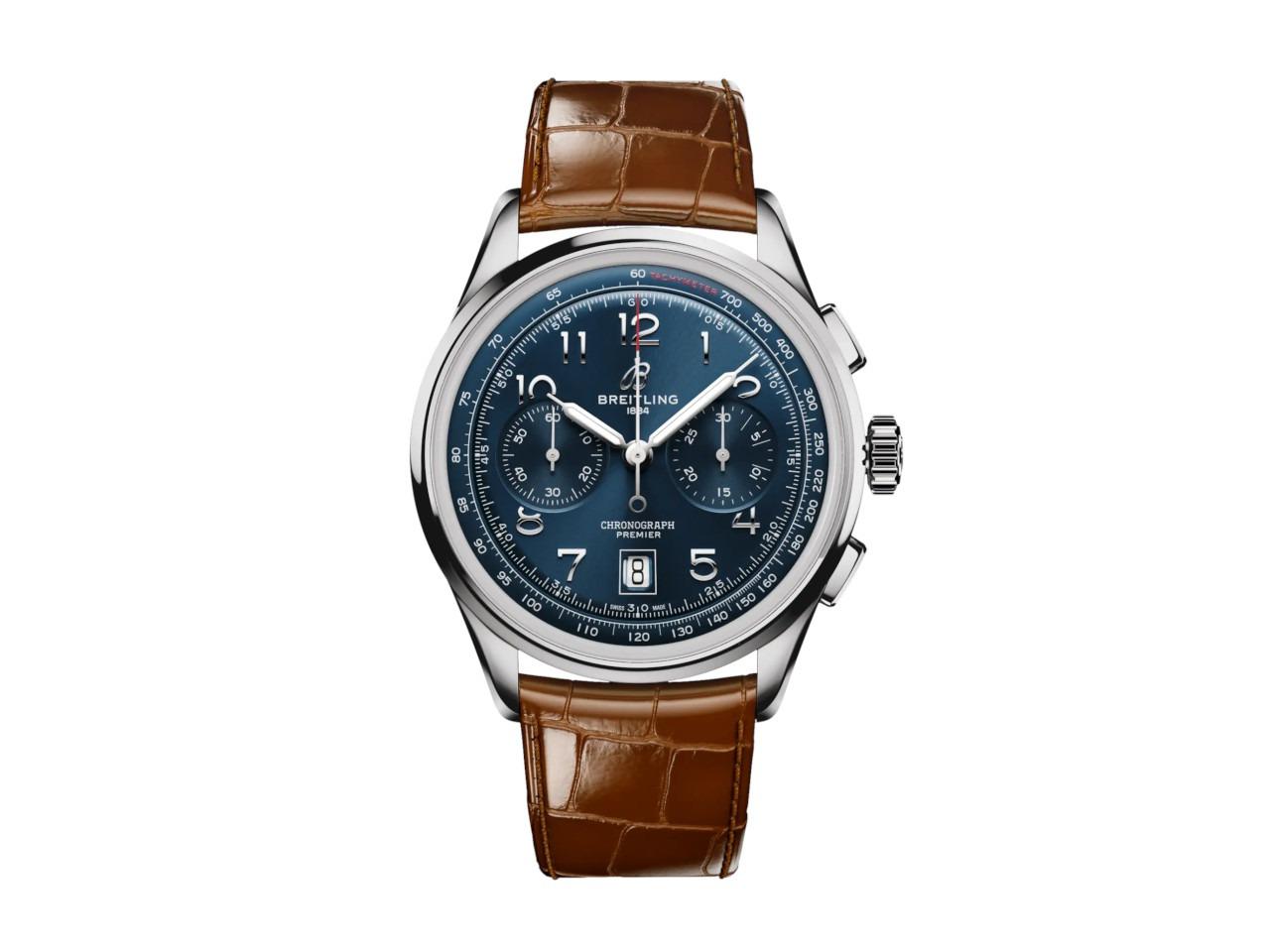 Breitling Premier B01 Chronograph 42 Automatik Edelstahl blaues Zifferblatt braunes Lederband
