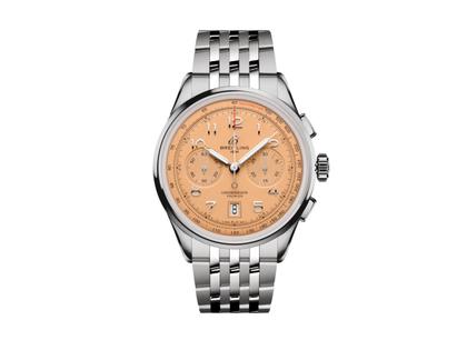 Breitling Premier B01 Chronograph 42 Automatik Edelstahl lachsfarbenes Zifferblatt Metallband
