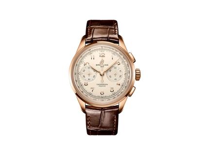 Breitling Premier B09 Chronograph 40 Automatik Rotgold silbernes Zifferblatt braunes Lederband
