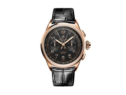 Manufakturkaliber: Automatikwerk, Kaliber B15 Duograph, Chronometer, Gehäuse aus 750/- Rotgold im Durchmesser von 42 mm, schwarzes Zifferblatt, Stoppfunktion mit Rattrapante-Funktion (Schleppzeiger-Chronograph), schwarzes Alligator-Lederband mit Faltschließe, Saphirglas, Glassichtboden, 10 bar wasserdicht
