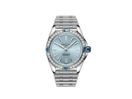 Breitling Kaliber 17, Automatikwerk, C.O.S.C. Chronometer, 38 Stunden Gangreserve, Edelstahlgehäuse mit einem Durchmesser von 38 mm, Höhe 11,8 mm, 32 erstklassische Labordiamanten (Brillanten), 1,41 ct TW vsi, Reiter und Krone aus blauer Keramik, hellblaues Zifferblatt (eisblau / ice blue) mit Indizes und Datumsanzeige, Rouleaux-Band, beidseitig entspiegeltes Saphirglas, verschraubte Krone, verschraubter Edelstahlboden, 10 bar wasserdicht