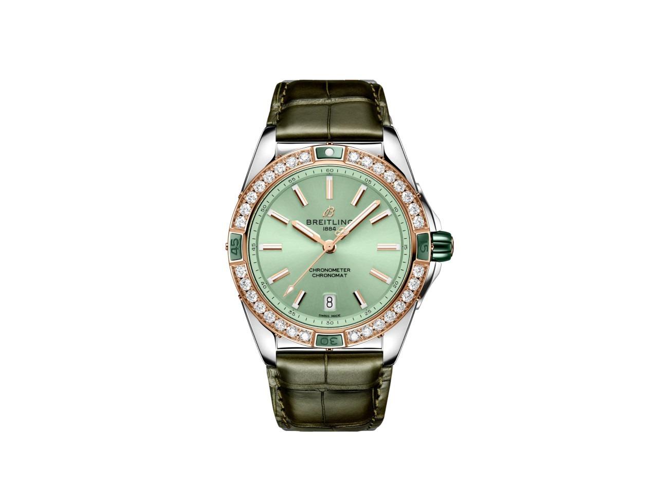 Breitling Kaliber 17, Automatikwerk, C.O.S.C. Chronometer, 38 Stunden Gangreserve, Edelstahlgehäuse mit Lünette aus 750/- Rotgold, Durchmesser von 38 mm, Höhe 11,8 mm, 32 erstklassische Labordiamanten (Brillanten), 1,41 ct TW vsi, Reiter und Krone aus grüner Keramik, mintgrünes Zifferblatt mit Indizes und Datumsanzeige, grünes Alligatorlederband mit Faltschließe, beidseitig entspiegeltes Saphirglas, verschraubte Krone, verschraubter Edelstahlboden, 10 bar wasserdicht