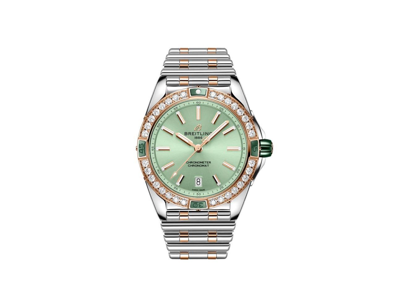 Breitling Kaliber 17, Automatikwerk, C.O.S.C. Chronometer, 38 Stunden Gangreserve, Edelstahlgehäuse mit Lünette aus 750/- Rotgold, Durchmesser von 38 mm, Höhe 11,8 mm, 32 erstklassische Labordiamanten (Brillanten), 1,41 ct TW vsi, Reiter und Krone aus grüner Keramik, mintgrünes Zifferblatt mit Indizes und Datumsanzeige, grünes Alligatorlederband mit Faltschließe, beidseitig entspiegeltes Saphirglas, verschraubte Krone, verschraubter Edelstahlboden, 10 bar wasserdicht