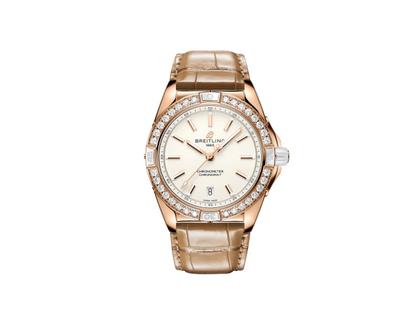 Breitling Kaliber 17, Automatikwerk, C.O.S.C. Chronometer, 38 Stunden Gangreserve, 750/- Rotgoldgehäuse mit einem Durchmesser von 38 mm, Höhe 11,82 mm, 32 erstklassische Labordiamanten (Brillanten), 1,41 ct TW vsi, Reiter und Krone aus weißer Keramik, beigefarbenes Zifferblatt, Indizes und Datumsanzeige auf 6 Uhr, hellbraunes Alligatorlederband, beidseitig entspiegeltes Saphirglas, verschraubte Krone, verschraubter Rotgoldboden, 10 bar wasserdicht