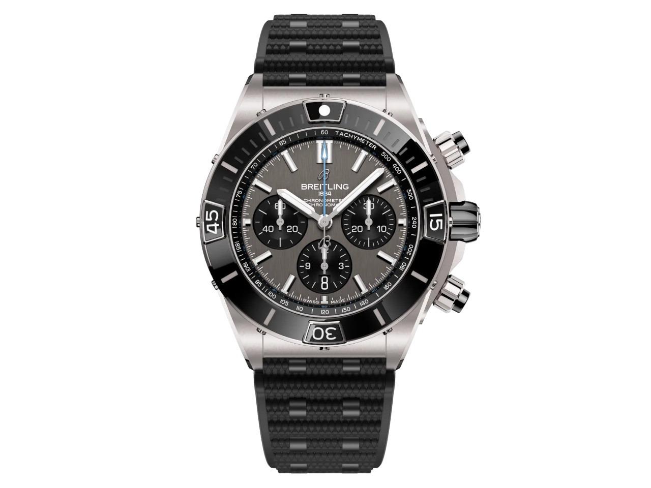 Breitling Manufaktur Kaliber 01, Automatikwerk, C.O.S.C. Chronometer, 70 Stunden Gangreserve, Titangehäuse, Durchmesser 44,0 mm, schwarze Keramiklünette, verschraubte Krone, anthrazitfarbenes Zifferblatt mit Indizes und Datumsanzeige auf 6 Uhr, kleine Sekunde, schwarzes Rouleaux-Kautschukarmband mit Faltschließe aus Titan, beidseitig entspiegeltes Saphirglas, verschraubter Saphirglasboden, 20 bar wasserdicht