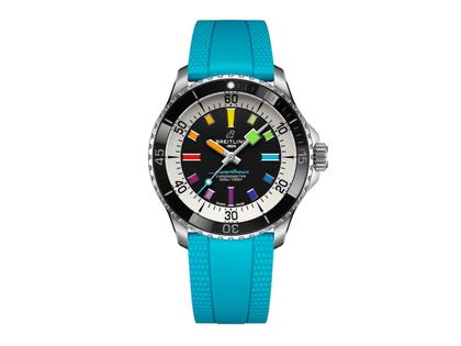 Breitling Superocean Automatic 42 Rainbow Edelstahl schwarzes Zifferblatt türkises Kautschukband