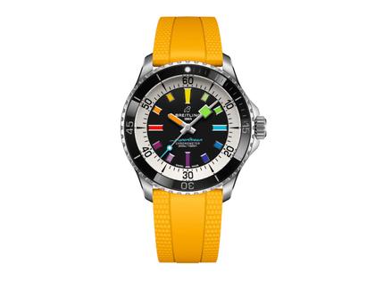 Breitling Superocean Automatic 42 Rainbow Edelstahl schwarzes Zifferblatt gelbes Kautschukband