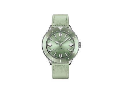 Automatikwerk Kaliber 10, C.O.S.C. Chronometer, Edelstahlgehäuse mit einem Durchmesser von 38 mm, beidseitig drehbare Lünette mit minzgrüner Keramik, grünes Zifferblatt mit markanten Indizes, grünes Lederband mit Faltschließe und Schnellwechsel-Federstegen, bombiertes Saphirglas beidseitig entspiegelt, 10 bar wasserdicht
