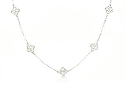 Wie eine sanfte Sommerbrise umschmeichelt die lange Halskette Chiara den Hals. Unbeschwert und edel, beeindruckt sie durch filigrane Ornamentik. Das Schmuckstück im Geiste italienischer Eleganz und Leichtigkeit vereint den verspielten Charme der gotischen Architektur mit dem Zauber zarter Spitzenstrukturen, die nicht nur in den ornamentalen Elementen, sondern auch in den einzelnen zarten Kettengliedern zum Ausdruck kommt.