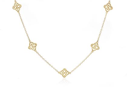 Wie eine sanfte Sommerbrise umschmeichelt die lange Halskette Chiara den Hals. Unbeschwert und edel, beeindruckt sie durch filigrane Ornamentik. Das Schmuckstück im Geiste italienischer Eleganz und Leichtigkeit vereint den verspielten Charme der gotischen Architektur mit dem Zauber zarter Spitzenstrukturen, die nicht nur in den ornamentalen Elementen, sondern auch in den einzelnen zarten Kettengliedern zum Ausdruck kommt.