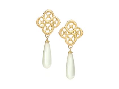 Wie ein reich verziertes Fenster eines venezianischen Palasts erscheint die Ornamentik der Ohrhänger „Chiara“. Der filigrane Ohrschmuck schlägt die Brücke zwischen Textilkunst und Architektur – und bleibt dabei ganz Schmuck. In dieser Variante wird das Sinnliche des Ornaments noch durch zwei weiße Mondsteinpampeln betont. Romantik von ihrer schönsten Seite!
