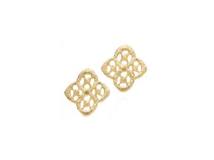 Wie ein reich verziertes Fenster eines venezianischen Palasts erscheint die Ornamentik der Ohrstecker „Chiara“. Der filigrane Ohrschmuck schlägt die Brücke zwischen Textilkunst und Architektur – und bleibt dabei ganz Schmuck.