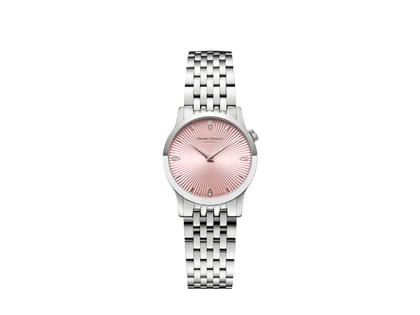 Die Bologna IV bietet eine stilvolle und elegante Option für Uhrenliebhaber. Das zierliche Gehäuse aus Edelstahl mit einem Durchmesser von 28,5 mm umschließt ein rosafarbenes Zifferblatt, das durch einen feinen Wellenschliff und vier brillante Tropfen-Indizes veredelt wird. Die Krone auf der 2-Uhr-Position bleibt ein markantes Designelement. Das Edelstahlband sorgt für einen angenehmen Tragekomfort, während das Ronda 1062 Uhrwerk, veredelt in Glashütte, für präzise Zeitmessung sorgt.