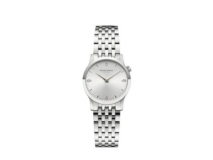 Quarz, Basiswerk Ronda 1062 in veredelter Ausführung, Edelstahlgehäuse, 28,5 mm Durchmesser, 6 mm Höhe, silberfarbenes Zifferblatt mit Prägung und 4 Brillanten zusammen 0,020 ct TW si, feingliedriges Edelstahlarmband mit Faltschließe, 16 mm Bandanstoß, Saphirglas innen entspiegelt, 3 bar wasserdicht