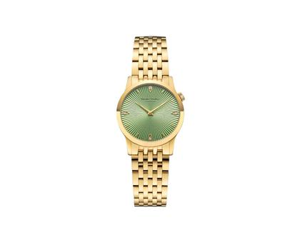 Quarz, Basiswerk Ronda 1062 in veredelter Ausführung, Edelstahlgehäuse gelbgoldfarben IP-beschichtet, 28,5 mm Durchmesser, 6 mm Höhe, grünes Zifferblatt mit Prägung und 4 Brillanten zusammen 0,020 ct TW si, feingliedriges Edelstahlarmband gelbgoldfarben IP-beschichtet mit Faltschließe, 16 mm Bandanstoß, Saphirglas innen entspiegelt, 3 bar wasserdicht