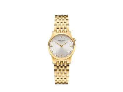 Die Bologna IV mit kompletter IP-Gold-Beschichtung ist eine luxuriöse Wahl für Kenner. Das Gehäuse mit einem Durchmesser von 28,5 mm und das silberne Zifferblatt, das durch einen Wellenschliff und vier brillante Tropfen-Indizes veredelt wird, sorgen für eine elegante Optik. Die Krone auf der 2-Uhr-Position verleiht der Uhr zusätzliches Flair. Das goldbeschichtete Edelstahlband bietet hohen Tragekomfort und das präzise Ronda 1062 Uhrwerk, veredelt in Glashütte, sorgt für verlässliche Zeitmessung.