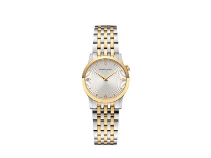 Die Bologna IV in der bicolor-Version kombiniert Edelstahl mit partieller IP-Gold-Beschichtung, was ihr ein modernes und elegantes Aussehen verleiht. Mit einem Gehäusedurchmesser von 28,5 mm und einem silberfarbenen Zifferblatt, das durch einen Wellenschliff und vier brillante Tropfen-Indizes verziert ist, bietet diese Uhr sowohl Stil als auch Funktionalität. Die Krone auf der 2-Uhr-Position bleibt ein hervorstechendes Designelement. Das Edelstahlband sorgt für Tragekomfort, während das Ronda 1062 Uhrwerk, veredelt in Glashütte, präzise Zeitmessung gewährleistet.